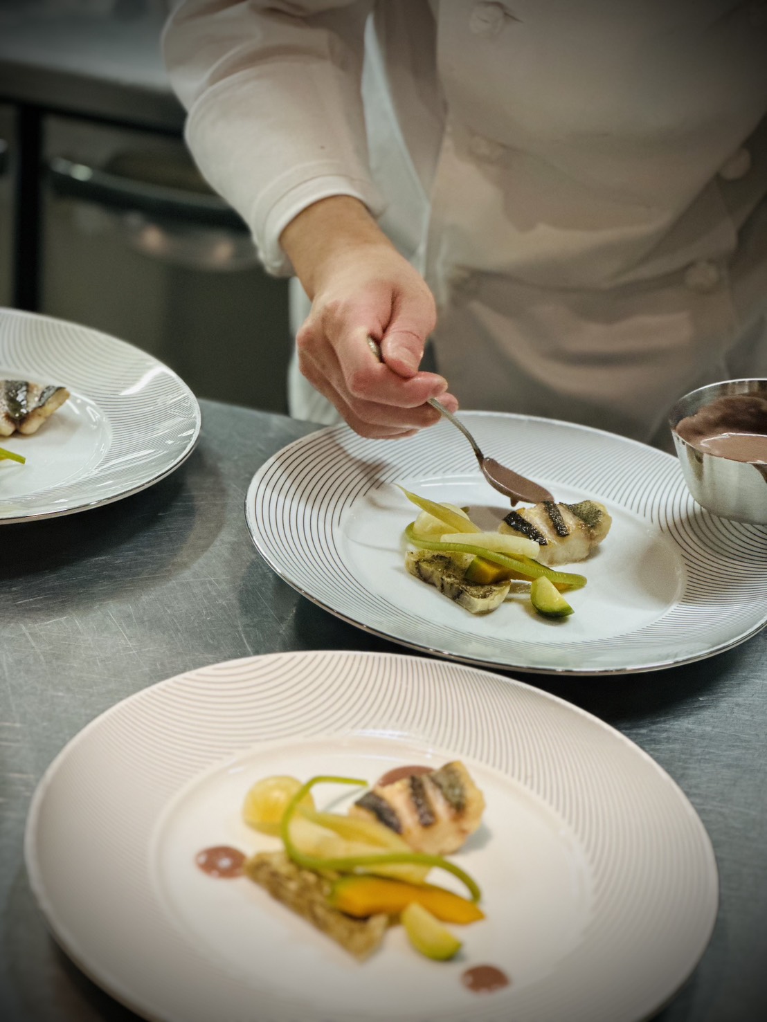 サフラン風味の魚のジュと法蓮草のクーリー - 黒毛和牛肉のグリエ