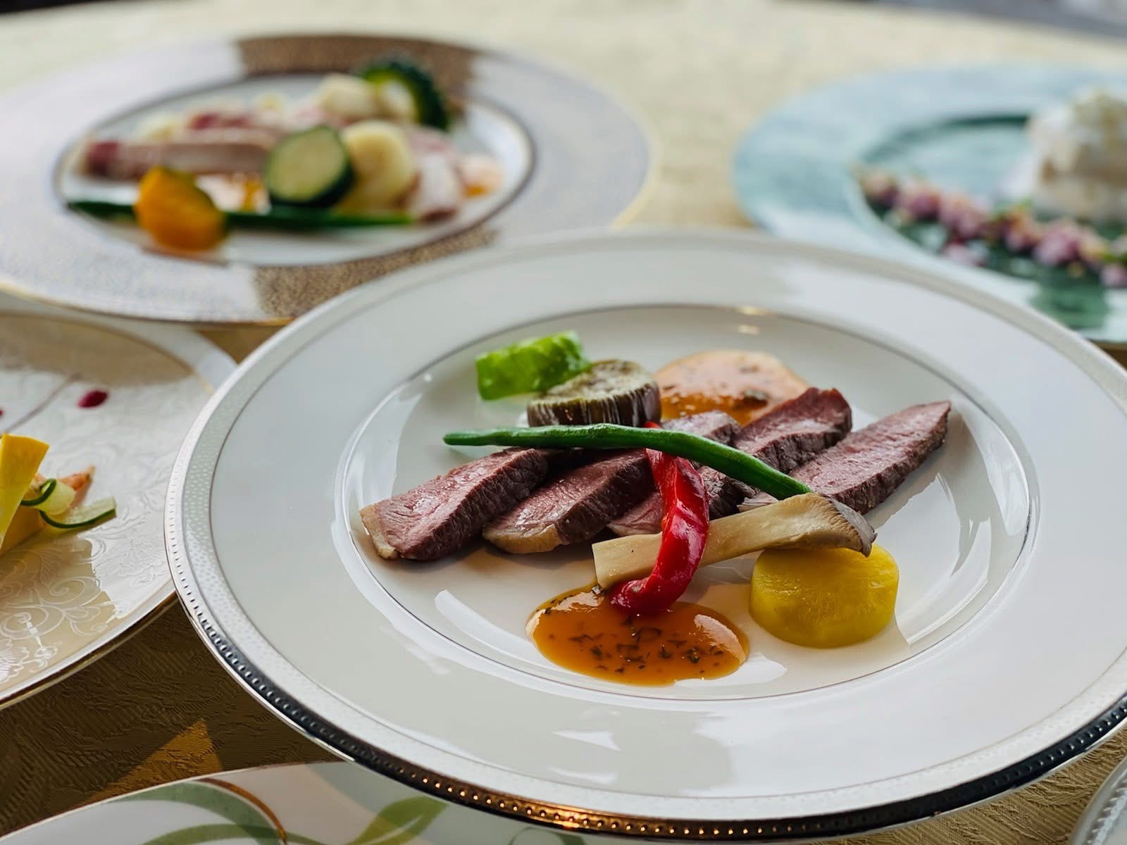 サフラン風味の魚のジュと法蓮草のクーリー - 黒毛和牛肉のグリエ